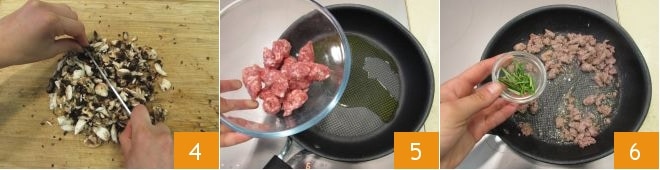 Tritura el interior de los hongos 4 y resérvalos momentáneamente junto con las cabezas. Calienta el aceite en una sartén, añade la pasta de salchicha 5 y sofríela brevemente desmenuzándola con una cuchara de madera, luego añade el romero 6