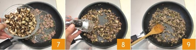 y los hongos picados 7; sala, añade pimienta 8 y cocina a fuego medio durante unos 5 minutos, removiendo de vez en cuando 9.