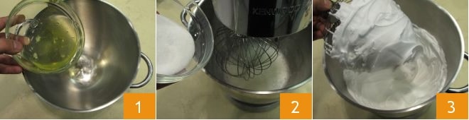 Para realizar la charlotte con mousse de chocolate negro, comienza a preparar la base de los bizcochos de soletilla: separa las yemas de las claras, en el bol de una batidora equipada con varillas, vierte las claras 1, pon en marcha la máquina y empieza a montar, añade también el azúcar poco a poco 2 y monta hasta que las claras estén blancas y brillantes 3,