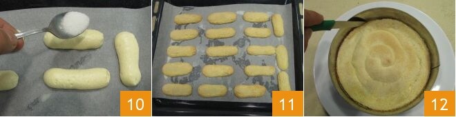 Espolvorea también la superficie de los bizcochos de soletilla con azúcar 10, hornea también los bizcochos de soletilla en horno estático precalentado a 190° durante 10 minutos (o en horno ventilado a 170° durante unos 8 minutos). Una vez cocidos, saca los bizcochos de soletilla 11 y la base y deja enfriar. Con un cuchillito, separa el borde de la base del aro de acero sin retirarlo 12, servirá para solidificar la crema.