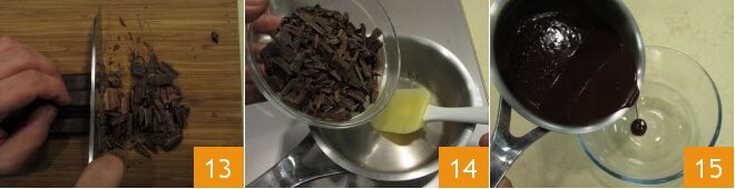Ahora encárgate de la mousse: pica el chocolate negro 13, en un cazo lleva a ebullición el agua, añade el chocolate 14 y emulsionar con una espátula, transfiere la mezcla de chocolate a un bol 15 e introdúcelo dentro de un bol más grande lleno de hielo.