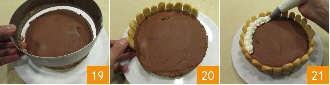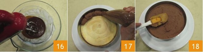 Monta la mezcla con las varillas eléctricas 16 durante unos 10-15 minutos o hasta que esté montada y fría. Transfiere la mousse a una manga pastelera, utiliza el disco de bizcocho de soletilla como base y aprieta encima la mousse 17, dentro del aro de 18 cm de diámetro y nivela la superficie con una espátula 18, deja solidificar el postre en la nevera durante 1 hora.