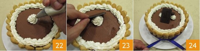 y luego un copete en el centro 22. Termina colocando dos hojuelas en el centro 23 y rodea la charlotte con mousse de chocolate negro con una cinta de raso 24.