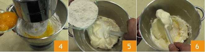 luego incorpora las yemas una a una 4 hasta que todo esté montado. Finalmente, añade la harina tamizada 5 y mezcla con la espátula 6 para amalgamar los ingredientes.