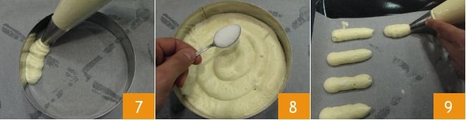 Y luego transfiere la mezcla a una manga pastelera. Ahora cubre una bandeja de horno con papel de hornear y coloca encima un aro de acero de 18 cm de diámetro, aprieta dentro la mezcla creando un disco 7 que será la base de la charlotte, espolvorea la superficie con azúcar 8 y hornea en horno estático precalentado a 190° durante 10 minutos (o en horno ventilado a 170° durante unos 8 minutos). Aprieta la mezcla restante en otra bandeja de horno forrada con papel de hornear creando bizcochos de soletilla de 6 cm de largo 9, obtendrás unos 24.