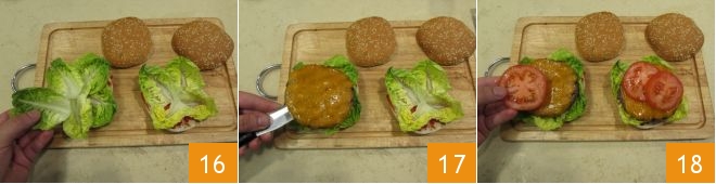 Y coloque encima los corazones de lechuga 16, luego la carne con el queso 17, después algunas rodajas de tomate 18,