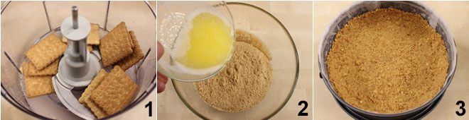 Para preparar la tarta de queso de limón con merengue, comienza con la base: coloca las galletas secas en el procesador 1 y luego tritúralas finamente. Pon la mantequilla a derretir en un cazo; mientras tanto, coloca las galletas trituradas en un bol y añade poco a poco la mantequilla derretida 2, mezclando todo bien. Engrasa un molde, mejor si es desmontable, de 22 cm de diámetro; recorta un disco de papel de horno del mismo diámetro que el fondo del molde y dos tiras de la misma altura que los bordes, y forra el molde. Haz clic aquí para ver el procedimiento. Vierte dentro las galletas trituradas en el molde cubierto con papel de horno y con la ayuda de una cuchara, compacta bien la base y los bordes del molde con las galletas 3. Deja enfriar la mezcla en el frigorífico durante media hora o en el congelador durante 15 minutos.