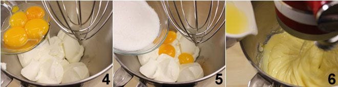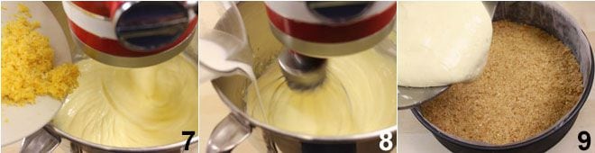 y la ralladura de dos limones 7. Por último, añade la nata fresca líquida en forma de hilo siempre con la batidora en funcionamiento 8. Ahora que la mezcla está lista, viértela dentro del molde 9 y hornea a 170 grados durante aproximadamente una hora en horno estático precalentado. Después de la cocción, deja enfriar la tarta de queso a temperatura ambiente y, una vez fría, colócala en el frigorífico durante al menos 4 horas.