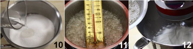 Ahora dedícate a la preparación del merengue italiano. En un cazo, calienta el azúcar cubriéndolo con agua 10 y espera a que alcance una temperatura de 121 grados 11. Mientras el azúcar alcanza la temperatura, monta las claras a punto de nieve, con una pizca de sal, y cuando estén espumosas, añade unas gotas de limón para estabilizarlas y sigue montando. Una vez que el azúcar haya alcanzado la temperatura, añádelo en forma de hilo a las claras con la batidora aún en funcionamiento 12.