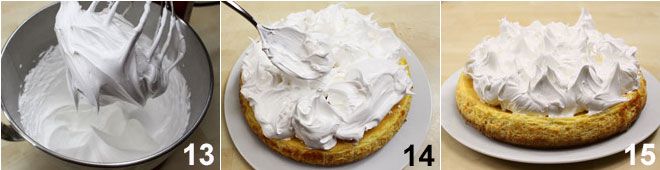 Continuamos batiendo hasta que el merengue esté completamente frío (bastará con tocar con las manos el bol y verificar que ya no haya calor). Debes obtener un merengue denso, liso y brillante 13. Una vez que la tarta de queso esté cocida, decoramos la superficie con el merengue preparado haciendo picos con una cuchara 14. Si lo prefieres, también puedes usar una manga pastelera. Una vez completada la decoración 15, pon la tarta en el horno con la función grill a máxima potencia durante 2 minutos. ¡Ahora solo queda comerla!