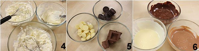 Ahora dedicad al relleno: preparad tres boles para las tres cremas y poned en cada uno 250 g de queso crema, mezclad para ablandarlo 4. Mientras tanto, derretid a baño maría (o en el microondas) los 3 tipos de chocolate por separado (5-6)