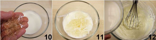 Ahora tomad tres boles y ablandad la gelatina necesaria para cada crema (3 g) por separado en agua fría durante 10 minutos. Luego, tomad otros 3 boles y verted en cada uno 80 ml de nata, que habréis calentado previamente, y en cada uno disolved la gelatina bien escurrida (3 g por cada bol) (10-11). Al final deberéis obtener 3 boles cada uno conteniendo 80 ml de nata y 3 g de gelatina disuelta. Incorporad el primero de los 3 compuestos de nata y gelatina al chocolate blanco utilizando un batidor 12.