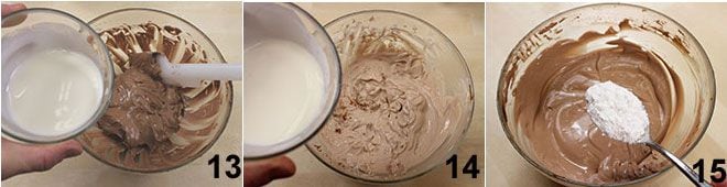 Haced la misma operación para los otros boles de nata y gelatina, incorporándolos tanto en el chocolate con leche como en el negro (13-14). Por último, añadid el azúcar glas mezclando con una espátula 15.