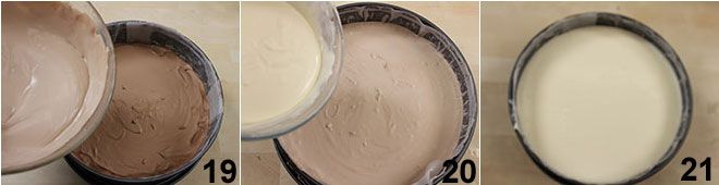 Haced la misma operación para todos los tipos de chocolate (16-17). Ahora que las cremas están listas, podéis montar la tarta de queso, sacad del frigorífico la base de galleta ya fría y compacta, comenzad vertiendo primero la crema de chocolate negro 18, dejad reposar en el frigorífico o congelador durante 15-20 minutos.