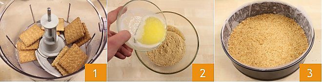Para preparar la cheesecake de chocolate y peras, comienza preparando la base: pon las galletas secas en la licuadora y enciéndela hasta triturarlas finamente 1. Derrite la mantequilla en una cacerola y mientras tanto transfiere las galletas trituradas a un tazón. Agrega poco a poco la mantequilla derretida a las galletas trituradas, mezclando bien todo 2. Engrasa un molde, preferiblemente desmontable, de 22 cm de diámetro y luego cubre el fondo y los bordes con papel de horno (descubre cómo hacerlo leyendo la Escuela de Cocina: forrar un molde con papel de horno, aquí). Vierte las galletas trituradas en el molde cubierto con papel de horno y con la ayuda de una cuchara compacta bien la base de galleta 3. Deja enfriar la mezcla en el frigorífico por media hora o en el congelador por unos diez minutos.
