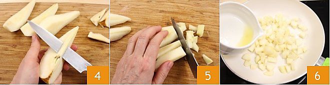 Ahora dedícate a la crema: limpia las peras, pelándolas y quitando las semillas 4 y córtalas en cubitos 5. Pon los cubitos de pera en una sartén antiadherente y cocina junto con el jugo de limón 6.