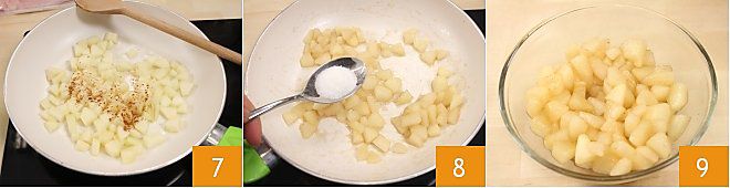 Agrega una pizca de canela 7, una cucharada de azúcar 8 y las 4 cucharadas de agua. Luego deja cocinar por unos minutos, hasta que las peras estén blandas y bastante secas. Una vez listas, ponlas a un lado en un tazón y deja que se enfríen 9.