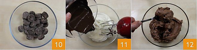 Ahora pasa a preparar el chocolate para mezclarlo con el queso crema: pon el chocolate negro en un tazón 10 y colócalo en una cacerola llena hasta la mitad con agua. Luego enciende el fuego y derrite el chocolate al baño maría. En un tazón aparte, pon el queso crema y el azúcar glas y mezcla los dos ingredientes con la batidora eléctrica. Luego agrega el chocolate derretido tibio y bate los ingredientes 11. Cuando obtengas una mezcla homogénea 12, transfiérela a una batidora de pie (o a un tazón grande para trabajarlo con una batidora eléctrica), agrega los huevos y enciende las batidoras.