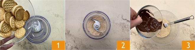 Para preparar la cheesecake con chocolate y caramelo salado, lo primero que debes hacer es empezar con la base. Coloca las galletas secas en un procesador de alimentos 1 y tritúralas hasta convertirlas en polvo 2. Transfiérelas a un bol y añade el chocolate fundido al baño maría o en microondas 3.