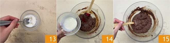 Calienta 1-2 cucharadas de nata, en el microondas o en un cazo, luego escurre la gelatina y disuélvela dentro de la nata, mezclando con una cuchara 13. Vierte esta mezcla dentro de la crema 14 y mezcla con cuidado 15.