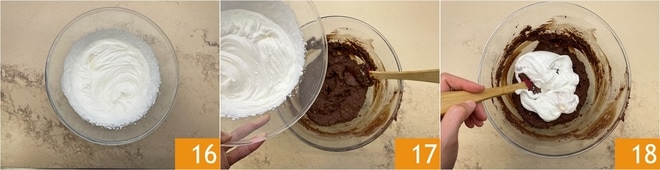 Ahora monta 200 g de nata 16. Viértela en la mezcla 17 y mezcla bien con la espátula 18.