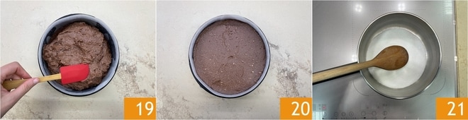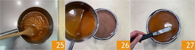 Mezcla bien 25 y reserva. Cuando la salsa de caramelo esté fría, viértela sobre el cheesecake 26. Nivela de nuevo la superficie con una espátula 27.