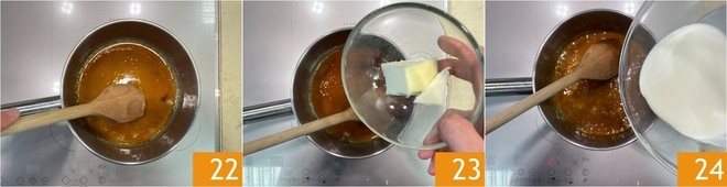 Deja que el azúcar se derrita completamente, girando de vez en cuando el cazo o mezclando con una cuchara de madera 22. En cuanto obtengas un caramelo ámbar, añade la mantequilla 23, baja el fuego y mezcla. Añade media cucharadita de sal y mezcla de nuevo. Una vez alcanzado el hervor, apaga el fuego. Luego añade también la nata, mejor si está caliente 24.