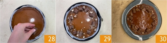 Decora con trozos de galletas de chocolate y caramelo 28 29 y colócala en la nevera durante al menos 2 horas. Desmolda el cheesecake, transfiérelo a un plato 30 y ¡disfrútalo!