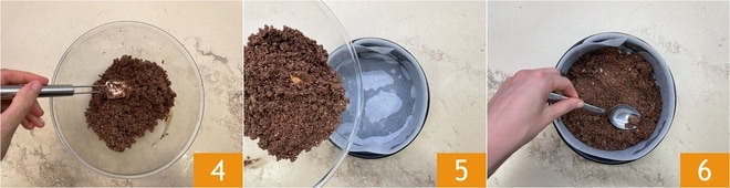 Añade una pizca de sal y mezcla bien hasta obtener una mezcla homogénea 4. Luego, transfiere a un molde previamente enmantequillado y forrado con papel de horno de 18 cm. Aplana presionando suavemente con el dorso de una cuchara 6.