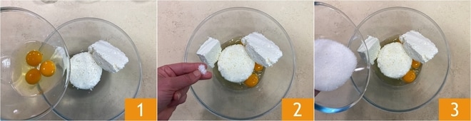 Para preparar la tarta de queso al horno con el tvorog, primero derrite la mantequilla y déjala templar. Vierte en un bol grande el queso tvorog, los huevos 1, la sal 2 y el azúcar 3.