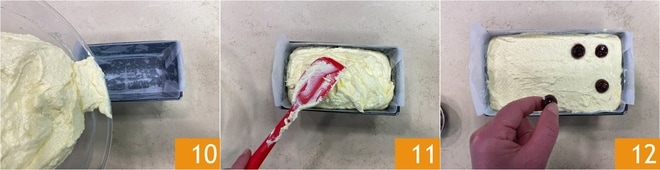 Vierte la mezcla en un molde de plumcake de 25x11x7 cm forrado con papel de horno 10 y nivela la superficie 11. Inserta las cerezas en almíbar en dos filas a distancia regular presionando ligeramente 12.
