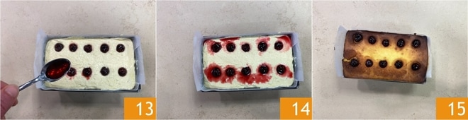 Completa rociando las cerezas con su almíbar 13 y golpea el molde sobre la mesa de trabajo para eliminar posibles burbujas de aire 14. Cocina la tarta de queso en la parrilla media del horno estático durante 60 minutos a 180°, colocando en el fondo del horno un recipiente con agua caliente para garantizar la humedad adecuada durante la cocción. Transcurrido el tiempo de cocción, abre ligeramente la puerta del horno y deja enfriar completamente la tarta de queso en su interior antes de desmoldarla 15. Una vez enfriada, guarda la tarta de queso al horno con el tvorog en el frigorífico durante al menos 3 horas antes de servirla.
