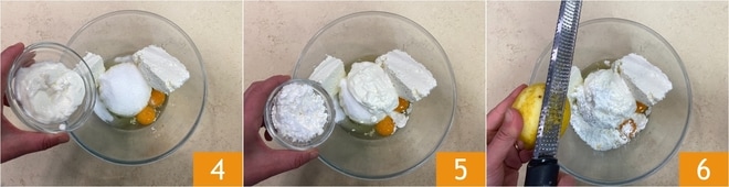 Agrega también la crema agria 4 y la maicena 5, luego ralla la cáscara del limón 6.