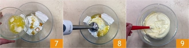 Finalmente, añade la mantequilla derretida y templada 7 y bate con la batidora de inmersión 8 hasta obtener una mezcla homogénea 9.