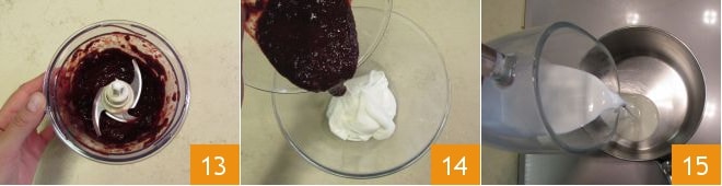 Debéis obtener un puré liso 13 para añadir a la mezcla de 250 g 14. Mientras tanto calentad 20 g de nata líquida, dividiéndola equitativamente en dos cacerolitas 15.
