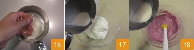 Disolved respectivamente los 9 g y los 5 g de gelatina amolecida y bien escurrida del agua 16. La mezcla de nata en la que habéis disuelto 5 g de gelatina se añade a la crema clara 17, mientras que la mezcla con 9 g de gelatina se debe añadir a la crema de moras 18.