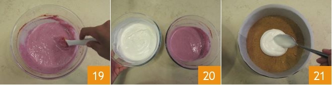 Mezclad cuidadosamente las mezclas 19 y, una vez listas 20, retomad el molde con la base de galleta y verted en el centro dos cucharadas de mezcla clara 21.