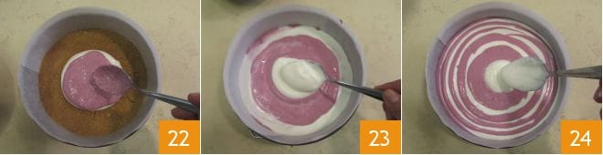 Con el dorso de la cuchara extendid la crema en el centro, luego verted encima otras dos cucharadas de crema de moras 22. Continuad alternando las cremas 23 24.