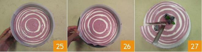 Una vez que la superficie esté completamente cubierta con la crema 25, colocad la tarta en la nevera para que se endurezca durante 4 horas. Transcurrido el tiempo de reposo, sacadla de la nevera 26, extraedla del molde y decorad con moras y hojas de menta al gusto 27.