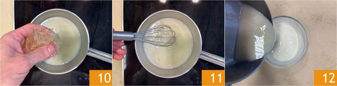 Añade la gelatina bien escurrida 10 y mezcla para disolverla completamente 11. Deja que la mezcla se entibie, luego viértela en un bol con el yogur 12.