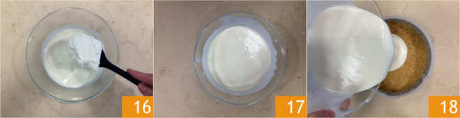Incorpora delicadamente la nata montada a la mezcla de yogur con una espátula 16, mezclando con movimientos suaves de abajo hacia arriba para no desmontar 17. Retira el molde de la nevera y vierte la crema obtenida sobre la base 18.