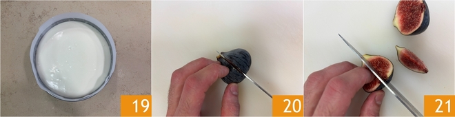 Nivela la superficie y deja que se solidifique en la nevera durante al menos 4 horas, mejor si es toda la noche 19. Poco antes de desmoldar el postre prepara la decoración: corta los higos por la mitad 20 y luego en gajos 21.
