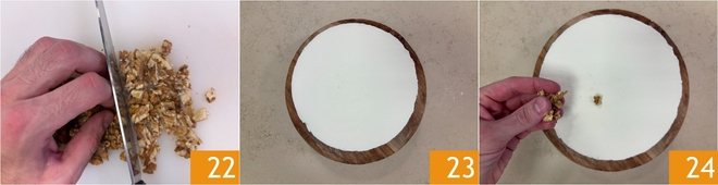Pica las nueces gruesamente 22. Una vez que la cheesecake esté firme, retírala delicadamente del molde 23 y decora la superficie con el granillo de nueces 24.