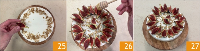 Completa con los gajos de higos frescos 25 y, si lo deseas, un hilo de miel para finalizar 26. ¡Sirve enseguida tu cheesecake de higos hecha en casa 27!