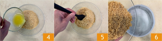 Transfiere la mezcla a un bol y vierte la mantequilla derretida 4, luego mezcla bien para combinar 5. Toma un molde desmontable de 20 cm de diámetro, fórralo con papel de horno y distribuye la mezcla de galletas en el fondo 6, presionando bien con el reverso de una cuchara.