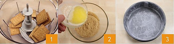 Para preparar la cheesecake Italia empezad preparando la base: poned las galletas secas en la picadora 1 y trituradlas finamente. Pon el mantequilla a derretir en un cazo; mientras tanto colocad las galletas trituradas en un bol y añadid el mantequilla derretida poco a poco 2, mezclando bien. Engrasad un molde, mejor si es desmontable, de 22 cm de diámetro; recortad un disco de papel de horno del mismo diámetro que la base del molde y dos tiras de la misma altura que los laterales, y forrad el molde 3 (para más detalles consultad la ficha Cómo forrar un molde con papel de horno que encontráis en la escuela de cocina).