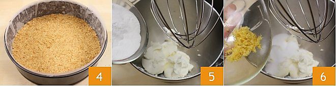Verted las galletas desmenuzadas en el molde forrado con papel de horno y, con ayuda de una cuchara, compactad bien la base de galleta 4. Dejad enfriar la mezcla en el frigorífico durante media hora o en el congelador unos diez minutos. Ahora dedicaos al relleno: poned el queso fresco para untar en una batidora planetaria equipada con varillas (alternativamente podéis usar unas varillas eléctricas), añadid el azúcar glas 5, la ralladura de limón 6 y batid hasta montar la mezcla.