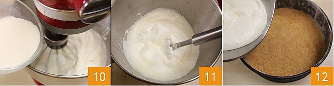 unid la nata con la gelatina a la crema de queso 10. Mezclad la crema con las varillas hasta que resulte compacta y homogénea 11. Ahora verted la crema en el molde con la base de galleta 12 ya fría y alisad la superficie con la ayuda de una espátula.