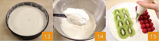 Poned la cheesecake Italia 13 en el frigorífico para que cuaje durante al menos 4 horas. Cuando la cheesecake esté cuajada, pasad a la decoración: cortad el kiwi en láminas, montad la nata con el azúcar glas 14 siguiendo las indicaciones que encontráis en la ficha Come montare la panna, poned la nata en una manga pastelera y empezad a componer la bandera italiana: repartid sobre la superficie de la tarta una franja de láminas de kiwi, una de frambuesas y, por último, rematad la bandera con montoncitos de nata 15. ¡Vuestra cheesecake Italia está lista para degustar!