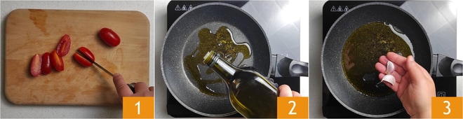 Para preparar la cheesecake salada con pesto y tomatitos, lo primero es dedicarse a la preparación de los tomatitos confit. Lavad los tomatitos y secadlos con papel absorbente o con un paño limpio, luego cortadlos por la mitad 1. En una sartén verted el aceite 2 y añadid el ajo 3.